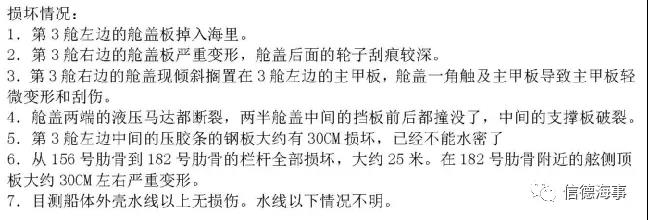 事故導致了百萬美金的巨大損失;幸運的是,事故發(fā)生時沒有任何人員站立在該艙左側(cè)甲板上;可以想象的是:如果當時有人站立在左側(cè),則很難幸免!