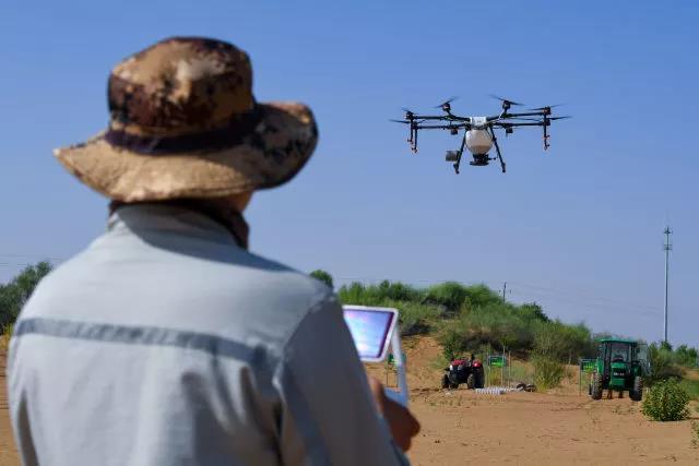 ↑這是內(nèi)蒙古鄂爾多斯市杭錦旗庫布其沙漠中的生態(tài)修復(fù)景觀(2018年7月11日無人機(jī)拍攝)