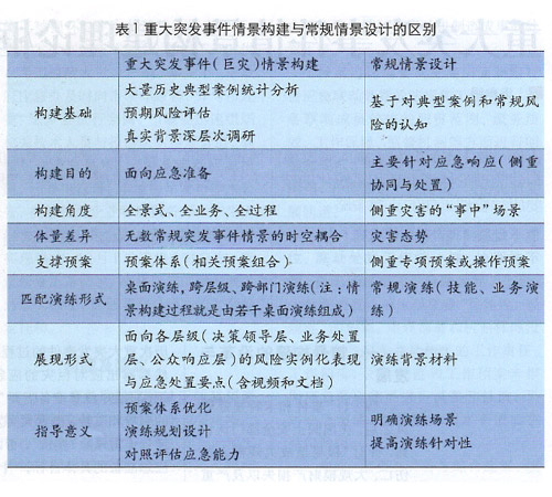 在傳統(tǒng)應(yīng)急管理中,實戰(zhàn)演練之前往往開展情景設(shè)計,常規(guī)情景設(shè)計與重大突發(fā)事件情景構(gòu)建無論在研究體量、研究目的,還是研究意義都存在著一定的差異,如表1所示。