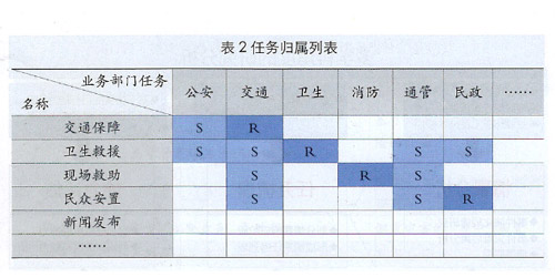 基于情景應(yīng)對的任務(wù)清單逐步清晰以后,可以通過業(yè)務(wù)部門的座談分析,明確各項任務(wù)的歸屬,得出表2所示的任務(wù)歸屬列表(R表示負(fù)責(zé)、S表示支持)。實踐表明,該項工作將會有效查漏補(bǔ)缺,優(yōu)化既有應(yīng)急機(jī)制,彌補(bǔ)體制上的條塊分割與碎片化問題。
