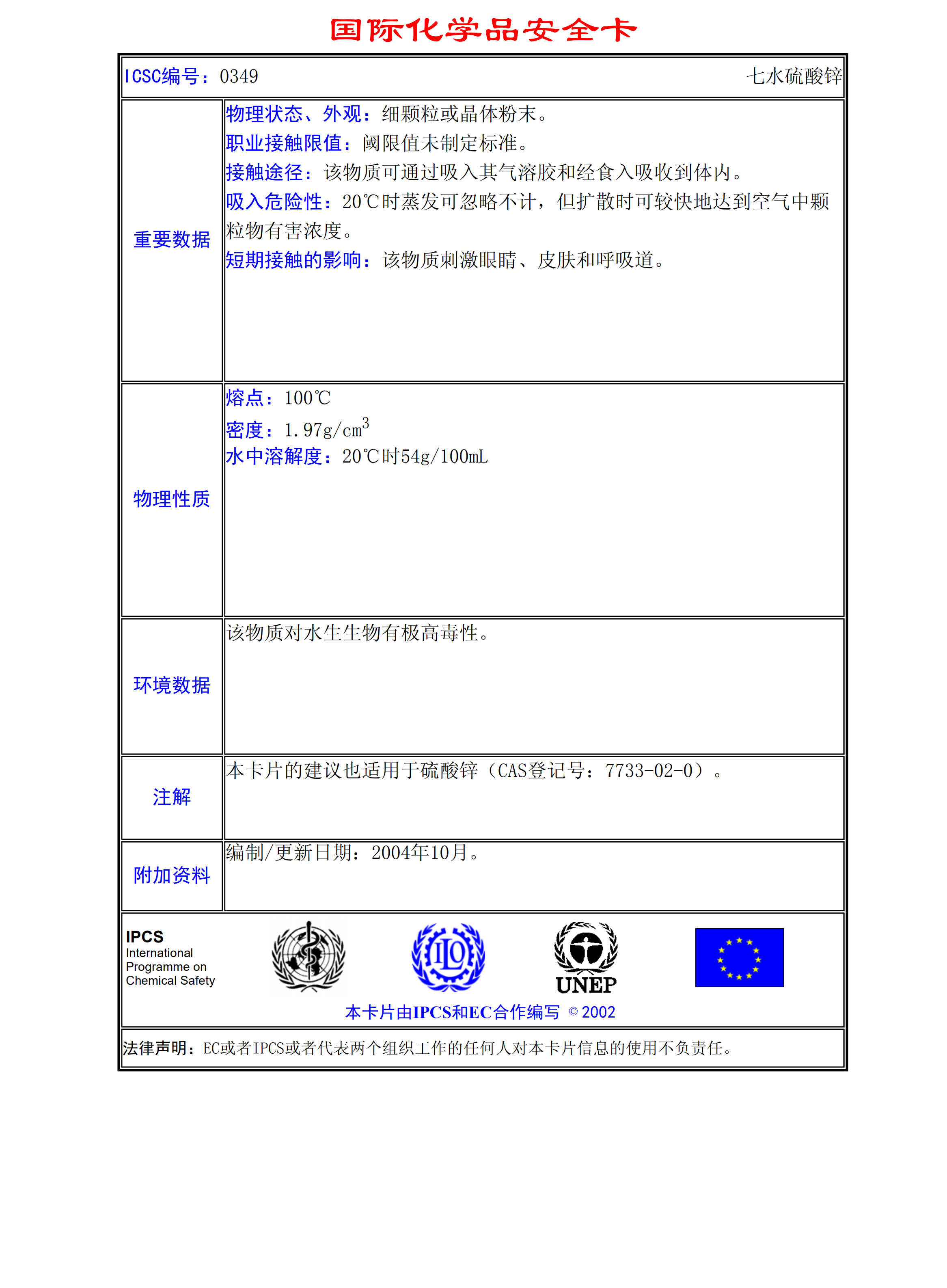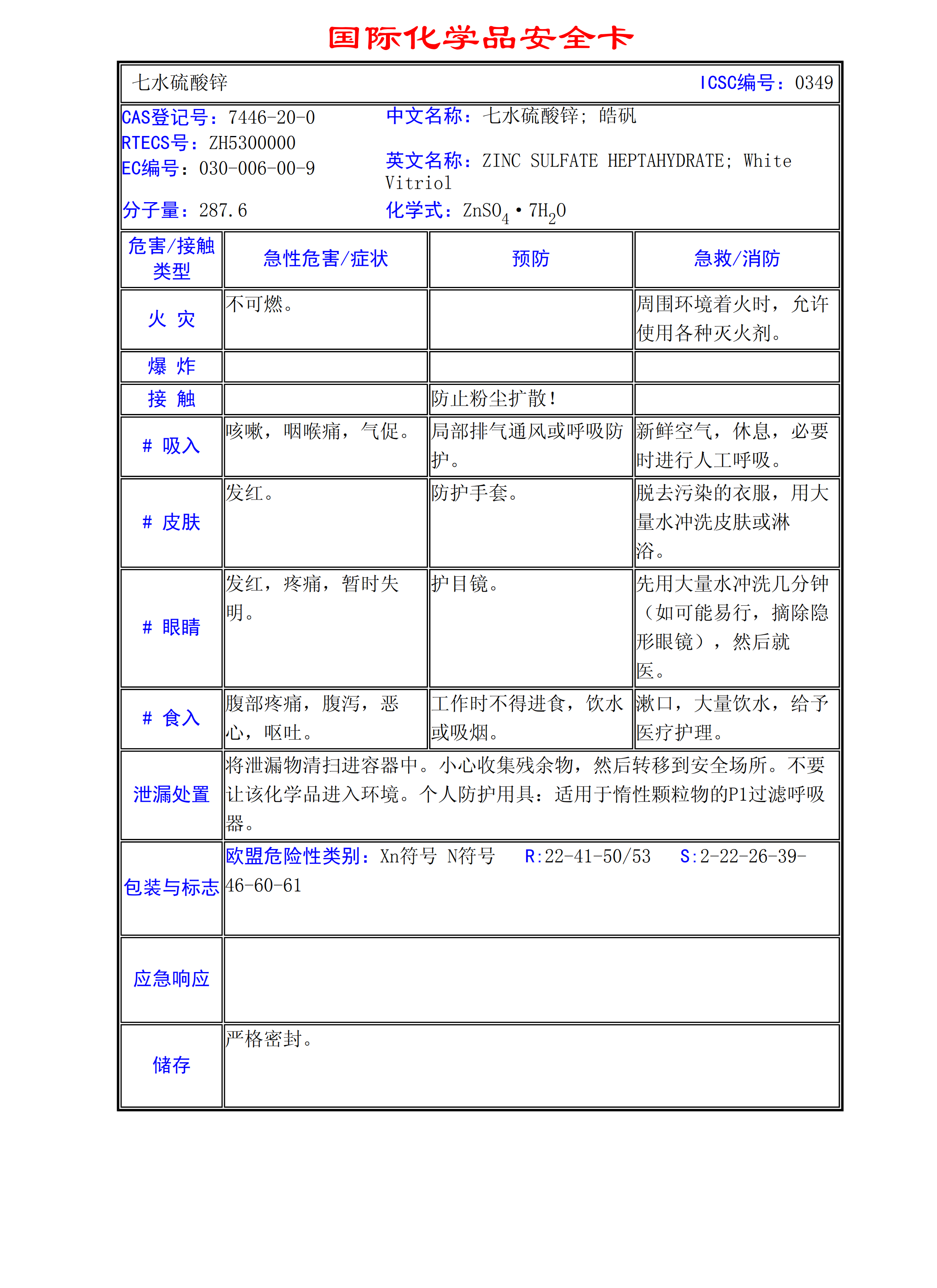七水硫酸鋅MSDS