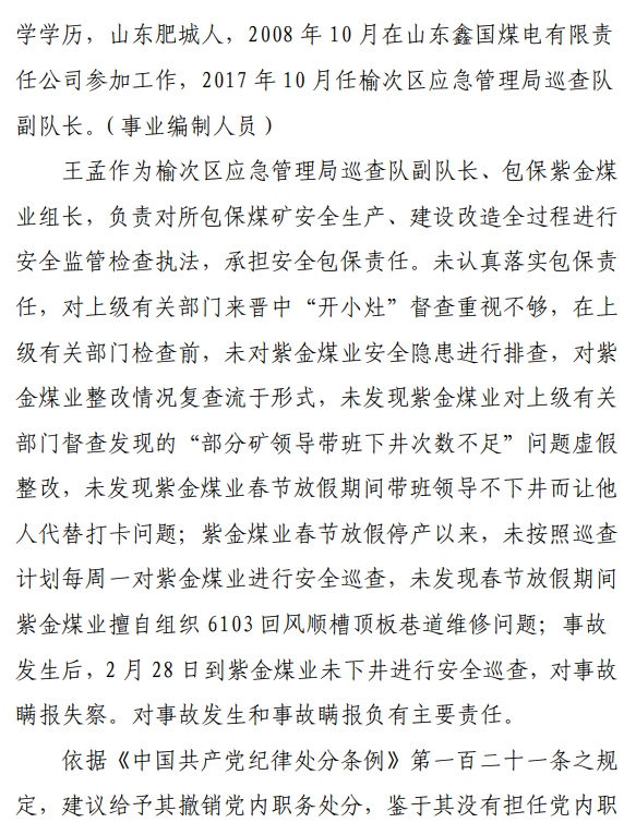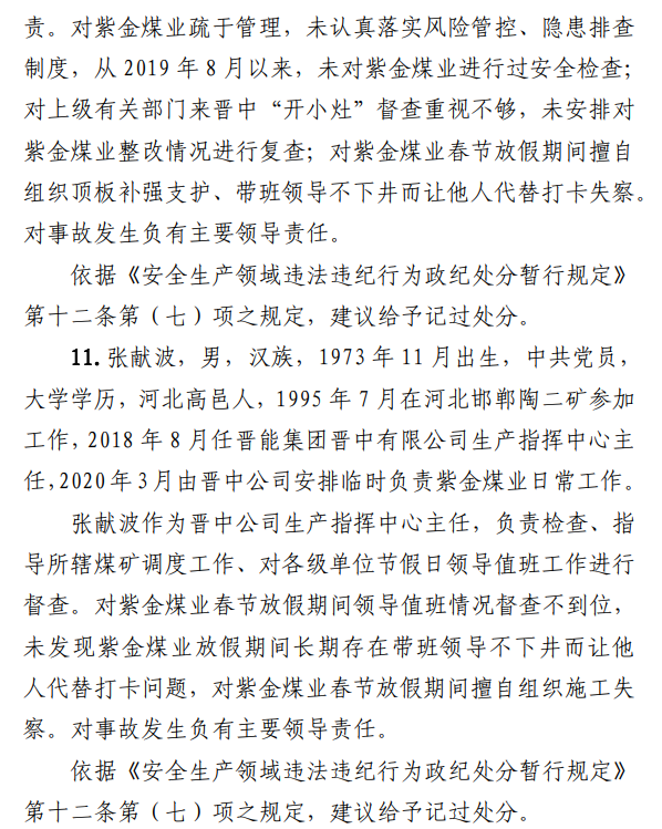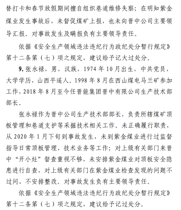 2月23日20時44分,探水隊副隊長王志平通過6103回風(fēng)順槽距開口950m處的電話,向礦調(diào)度室匯報了事故情況。20時46分,調(diào)度值班人員張宏強向礦長郭英杰匯報事故情況。郭英杰立即啟動應(yīng)急救援預(yù)案,組織煤礦相關(guān)人員開展搶險救援工作。救援人員使用單體液壓支柱、半圓木、鉸接梁對事故地點外圍巷道進行臨時支護,然后由外到里清渣、支護,實施救援。被冒落頂板埋壓的劉永生、馬練水和王秀國于2月24日14時30分、2月25日6時30分、2月25日14時分別被救出升井。經(jīng)醫(yī)生在井口確認,3人已無生命體征,之后被送往榆次區(qū)殯儀館,搶險救援工作結(jié)束。2月24日,礦長郭英杰安排信息中心主任梁煥修改人員定位系統(tǒng),關(guān)閉了工業(yè)視頻,刪除調(diào)度錄音通訊、虹膜數(shù)據(jù)。2月25日17時許,紫金煤業(yè)紀檢書記、黨總支副書記高建忠(臨時主持紫金煤業(yè)董事會及黨務(wù)日常事務(wù))和礦長郭英杰組織召開煤礦管理層會議。會上郭英杰、高建忠、紫金煤業(yè)安全生產(chǎn)技術(shù)總監(jiān)南海為了瞞報事故,對偽造出入井數(shù)據(jù)、修改人員定位數(shù)據(jù)、銷毀調(diào)度電話錄音、刪除視頻監(jiān)控資料、清理井下事故現(xiàn)場等事項進行了安排。2月24日至25日,高建忠安排生產(chǎn)副礦長杜永忠、安全副礦長楊雙喜等人與遇難者家屬協(xié)商辦理賠償事宜,并安排遇難者家屬配合礦方瞞報事故。3月5日,在榆次區(qū)人民政府組織的核查過程中,郭英杰、高建忠均否認事故發(fā)生,郭英杰、高建忠、南海繼續(xù)安排煤礦有關(guān)工作人員瞞報事故。3月8日上午9時許,在榆次區(qū)人民政府已查實事故、正在擬文上報的期間,紫金煤業(yè)向山西煤銷晉中公司、榆次區(qū)應(yīng)急管理局和晉中煤監(jiān)分局電話匯報事故,稱三名巡檢人員走到事故地點時,頂板突然冒落導(dǎo)致事故發(fā)生,謊報了事故的經(jīng)過和原因。2月23日22時左右,武全珍在井下安排王家偉完善措施內(nèi)容。王家偉出井后在措施中增加了:“頂板較完整區(qū)域補強支護期間采用單體支柱+鉸接頂梁做臨時支護,頂板不平整處使用方木墊平、木楔背緊背實”,和“臨時支護安全技術(shù)措施”相關(guān)內(nèi)容。2月24日上午,武全珍安排王家偉在該措施中增加了“絞車運輸安全技術(shù)措施”和“移動乳化液泵使用安全技術(shù)措施”等內(nèi)容。3月8日,生產(chǎn)礦長杜永忠安排探水隊隊長王聚寶在班前會記錄中加上“先抽400米水”。當天晚上,安全礦長楊雙喜在在班前會記錄中加上“不準進尺,打好臨時支護再作業(yè)”等內(nèi)容。現(xiàn)場人員在無臨時支護的情況下違章進行補強支護作業(yè),施工過程中頂板失穩(wěn)冒落,導(dǎo)致事故發(fā)生。1.紫金煤業(yè)對處于極限平衡狀態(tài)的6103回風(fēng)順槽頂板存在的安全隱患辨識不清、安全風(fēng)險管控不力6103回風(fēng)順槽巷道埋深大、圍巖較軟,且為迎采對掘巷道,受臨近的6101工作面開采動壓影響大,多根錨桿錨索斷裂失效,巷道變形,底板鼓起,事故地點附近巷道頂板已處于高應(yīng)力的極限平衡狀態(tài)。事故發(fā)生前,事故地點附近巷道頂板已先后發(fā)生兩次冒落。紫金煤業(yè)對6103回風(fēng)順槽頂板存在的安全隱患辨識不清、重視不夠,未切實進行礦壓日常監(jiān)測分析,未對斷裂失效錨桿及時補強支護,施工時未采取臨時支護,安全風(fēng)險管控不力。2.紫金煤業(yè)技術(shù)管理工作有漏洞,《6103回風(fēng)順槽補強支護施工安全技術(shù)措施》對現(xiàn)場作業(yè)指導(dǎo)性差紫金煤業(yè)編制的《6103回風(fēng)順槽補強支護施工安全技術(shù)措施》對巷道補強支護作業(yè)的臨時支護形式、技術(shù)參數(shù)和要求不具體,對現(xiàn)場作業(yè)指導(dǎo)性差。生產(chǎn)技術(shù)科科長王家偉編制措施前未到6103回風(fēng)順槽實地查看頂板情況,生產(chǎn)礦長杜永忠、安全礦長楊雙喜、總工程師武全珍及相關(guān)部門負責(zé)人會審措施時審查把關(guān)不嚴,措施僅由探水隊隊長在班前會進行宣讀,學(xué)習(xí)貫徹不到位。3.6103回風(fēng)順槽補強支護作業(yè)勞動組織混亂,現(xiàn)場安全監(jiān)管缺位事故當班,在探水隊隊長提出本隊人員不熟悉支護作業(yè)的情況下,礦領(lǐng)導(dǎo)違章指揮,仍然抽調(diào)安監(jiān)科和探水隊人員進行支護作業(yè)。作業(yè)人員安全風(fēng)險辨識能力不足,安全意識淡薄。事故當班無帶班礦領(lǐng)導(dǎo)和跟班隊長,未設(shè)專職安監(jiān)員,現(xiàn)場安全監(jiān)管缺位。4.紫金煤業(yè)礦領(lǐng)導(dǎo)帶班下井制度形同虛設(shè)礦長郭英杰安排春節(jié)放假期間帶班礦領(lǐng)導(dǎo)可以不下井,將各自的人員定位卡放在調(diào)度室,調(diào)度員按帶班計劃表安排安全員將帶班礦領(lǐng)導(dǎo)的人員定位卡帶入井下。自春節(jié)放假至事故發(fā)生時,紫金煤業(yè)礦領(lǐng)導(dǎo)均未執(zhí)行帶班下井制度。5.紫金煤業(yè)在春節(jié)停產(chǎn)放假、未復(fù)產(chǎn)期間,未經(jīng)批準擅自組織6103回風(fēng)順槽頂板補強支護作業(yè)2月23日下午,紫金煤業(yè)將《關(guān)于6101設(shè)備回撤密閉等井下工程施工請示》(包括6103回風(fēng)順槽補強支護作業(yè)的內