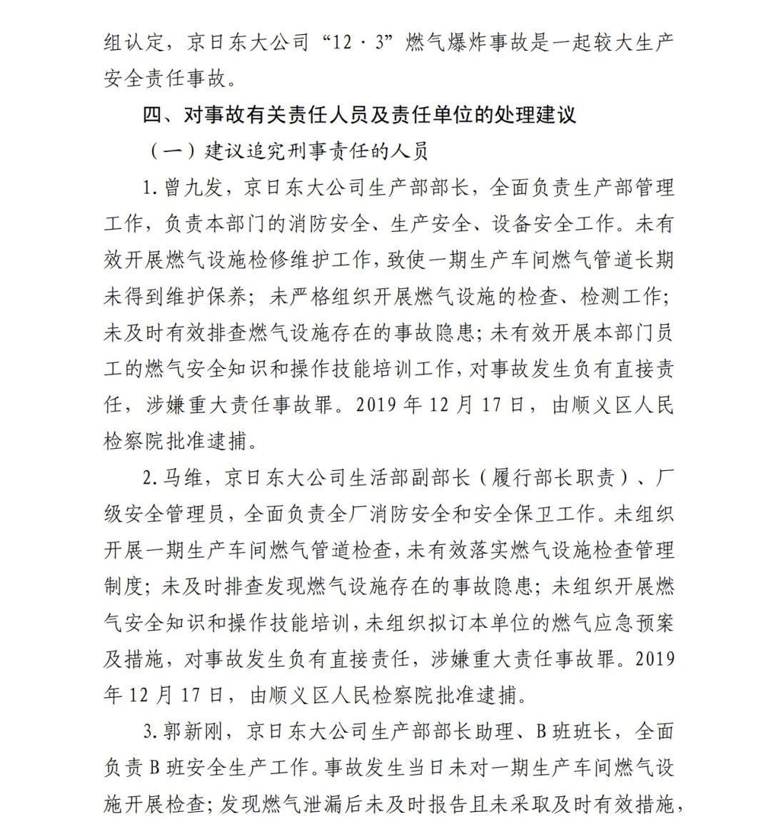 2.馬維,京日東大公司生活部副部長(履行部長職責(zé))、廠級(jí)安全管理員,全面負(fù)責(zé)全廠消防安全和安全保衛(wèi)工作。未組織開展一期生產(chǎn)車間燃?xì)夤艿罊z查,未有效落實(shí)燃?xì)庠O(shè)施檢查管理制度;未及時(shí)排查發(fā)現(xiàn)燃?xì)庠O(shè)施存在的事故隱患;未組織開展燃?xì)獍踩R(shí)和操作技能培訓(xùn),未組織擬訂本單位的燃?xì)鈶?yīng)急預(yù)案及措施,對(duì)事故發(fā)生負(fù)有直接責(zé)任,涉嫌重大責(zé)任事故罪。2019 年 12 月 17 日,由順義區(qū)人民檢察院批準(zhǔn)逮捕。
