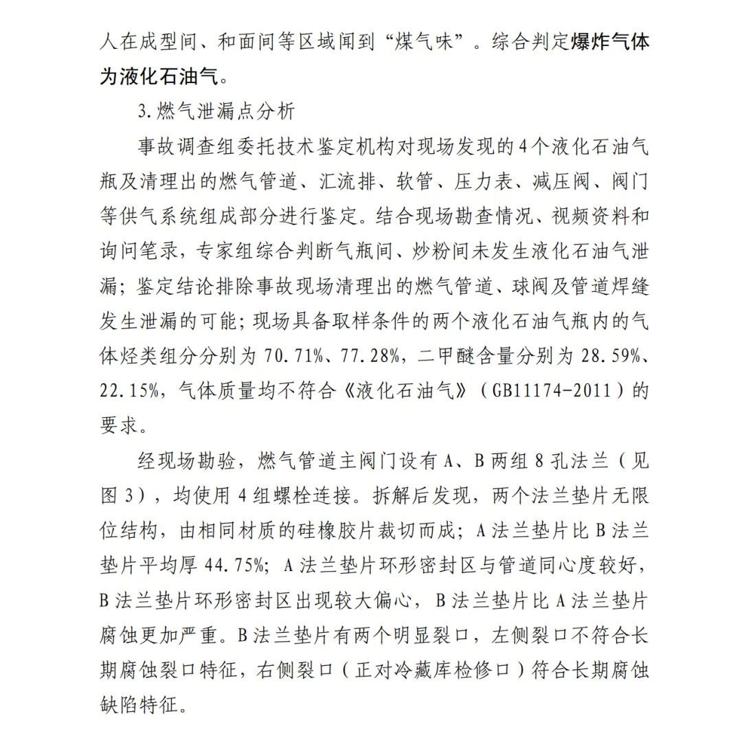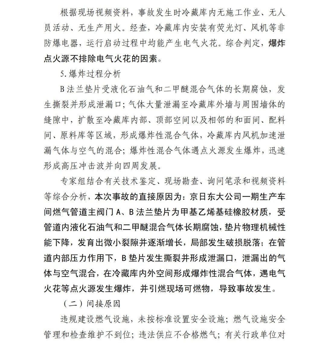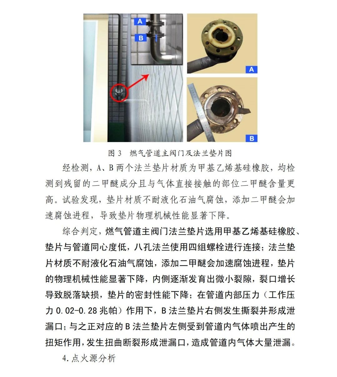 本次事故的直接原因?yàn)椋?/span>京日東大公司一期生產(chǎn)車間燃?xì)夤艿乐鏖y門A、B法蘭墊片為甲基乙烯基硅橡膠材質(zhì),受管道內(nèi)液化石油氣和二甲醚混合氣體長期腐蝕,墊片物理機(jī)械性能下降,發(fā)育出微小裂隙并逐漸增長,局部發(fā)生破損脫落;在管道內(nèi)部壓力作用下,B墊片發(fā)生撕裂并形成泄漏口,泄漏出的氣體與空氣混合,在冷藏庫內(nèi)外空間形成爆炸性混合氣體,遇電氣火花等點(diǎn)火源發(fā)生爆炸,并引燃現(xiàn)場(chǎng)可燃物,導(dǎo)致事故發(fā)生。