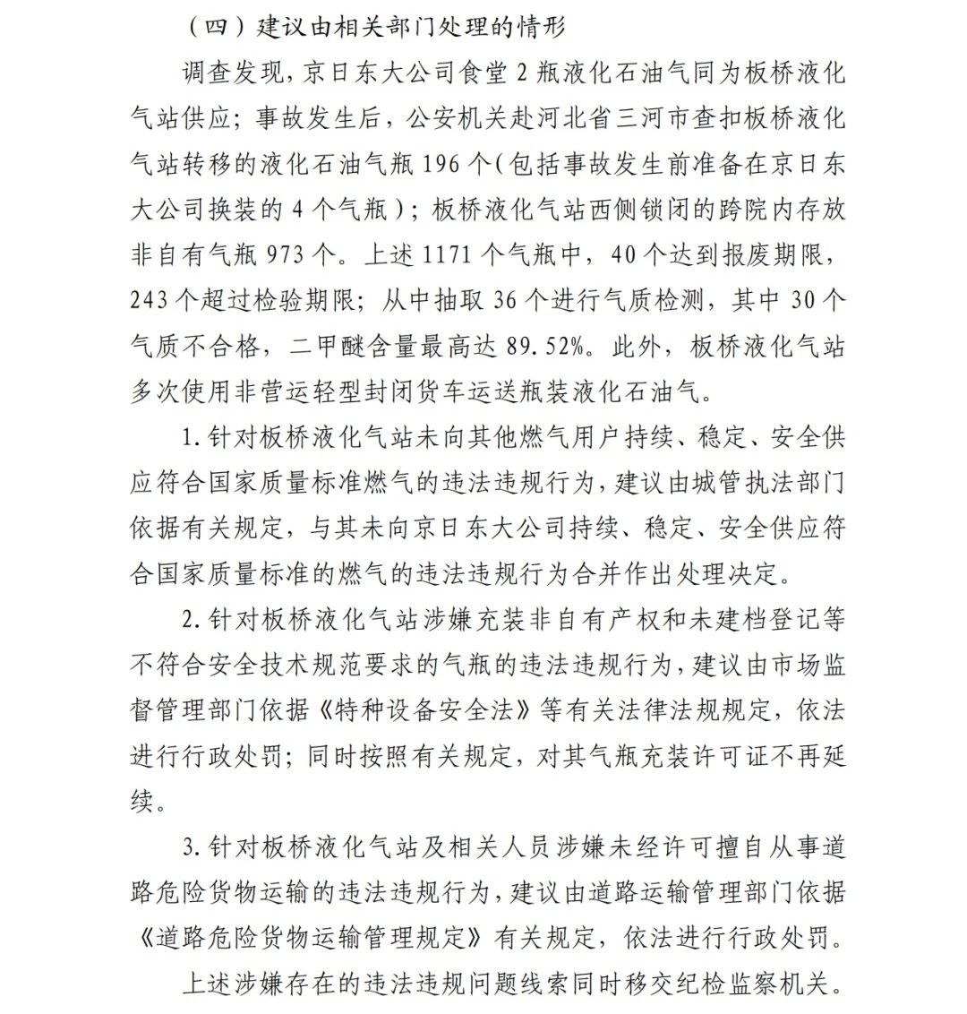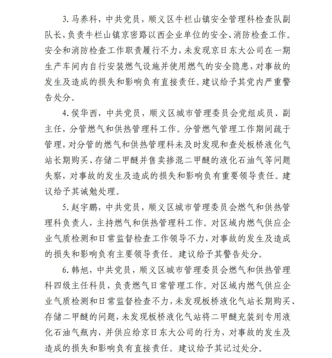 4.方勇忠,曾先后擔(dān)任京日東大公司生活部副部長兼設(shè)備部部長助理、設(shè)備部部長、生產(chǎn)部部長兼設(shè)備部部長、總經(jīng)理助理(2019年4月辭職)。2006年負(fù)責(zé)京日東大公司一期生產(chǎn)車間建設(shè)工作,期間未委托具有相應(yīng)資質(zhì)的施工單位,組織本單位人員自行建設(shè)安裝燃?xì)庠O(shè)施,導(dǎo)致燃?xì)庠O(shè)施安全隱患長期存在;2018 年負(fù)責(zé)一期生產(chǎn)車間內(nèi)新建冷藏庫建設(shè),將部分管道、閥門等燃?xì)庠O(shè)施封閉在通風(fēng)不良的場(chǎng)所內(nèi),且未設(shè)置通風(fēng)、燃?xì)庑孤﹫?bào)警等安全設(shè)施,對(duì)事故發(fā)生負(fù)有直接責(zé)任,涉嫌重大責(zé)任事 故罪。2020 年 1 月 23 日被順義公安分局刑事拘留,2 月 6 日取 保候?qū)?,建議依法追究刑事責(zé)任。