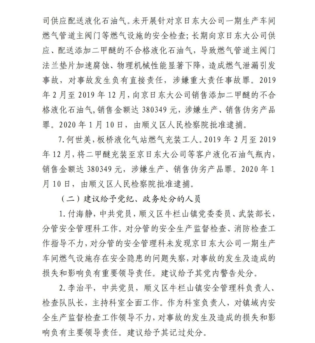 6.吳建新,板橋液化氣站工作人員,具體負(fù)責(zé)向京日東大公15司供應(yīng)配送液化石油氣。未開展針對(duì)京日東大公司一期生產(chǎn)車間燃?xì)夤艿乐鏖y門等燃?xì)庠O(shè)施的安全檢查;長期向京日東大公司供應(yīng)、配送添加二甲醚的不合格液化石油氣,導(dǎo)致燃?xì)夤艿乐鏖y門法蘭墊片加速腐蝕、物理機(jī)械性能顯著下降,造成燃?xì)庑孤┮l(fā) 事故,對(duì)事故發(fā)生負(fù)有直接責(zé)任,涉嫌重大責(zé)任事故罪。2019 年 2 月至 2019 年 12 月,向京日東大公司銷售添加二甲醚的不合 格液化石油氣,銷售金額達(dá) 380349 元,涉嫌生產(chǎn)、銷售偽劣產(chǎn)品 罪。2020 年 1 月 10 日,由順義區(qū)人民檢察院批準(zhǔn)逮捕。
