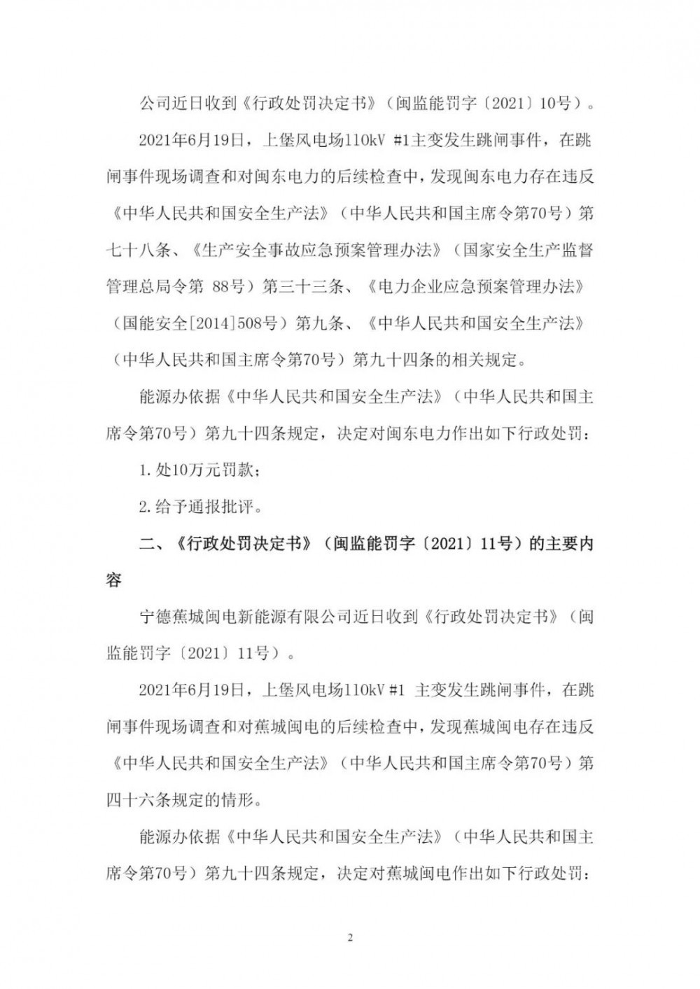 《公告》顯示,2021年6月19日,因上堡風(fēng)電場110kV#1主變發(fā)生跳閘事件,在跳閘事件現(xiàn)場調(diào)查和對閩東電力的后續(xù)檢查中,發(fā)現(xiàn)閩東電力、蕉城閩電、環(huán)三億能均存在違反相關(guān)法律條文的情況,分別處以10萬元、5萬元、5萬元的罰款。