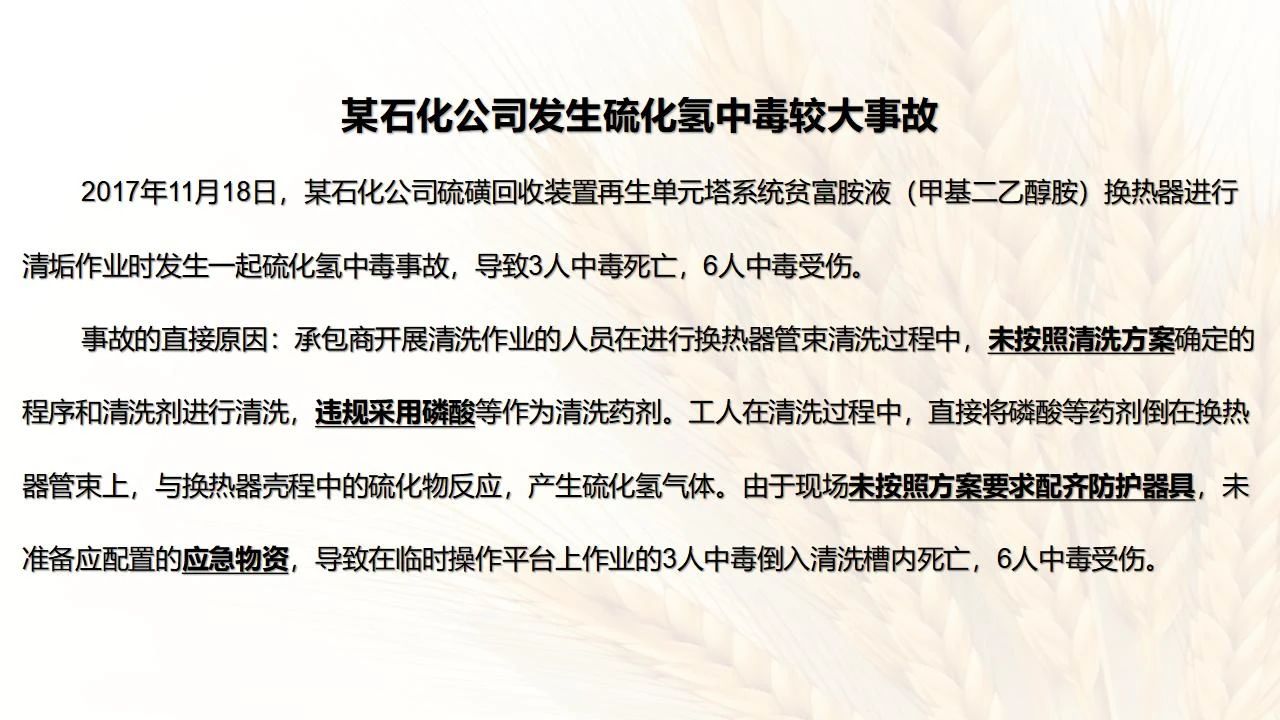 清洗作業(yè)使用含硫的清洗劑;裝置、容器、管道、換熱器等,其物料及結(jié)垢含有硫及硫的化合物,在一定條件下會產(chǎn)生硫化氫氣體。