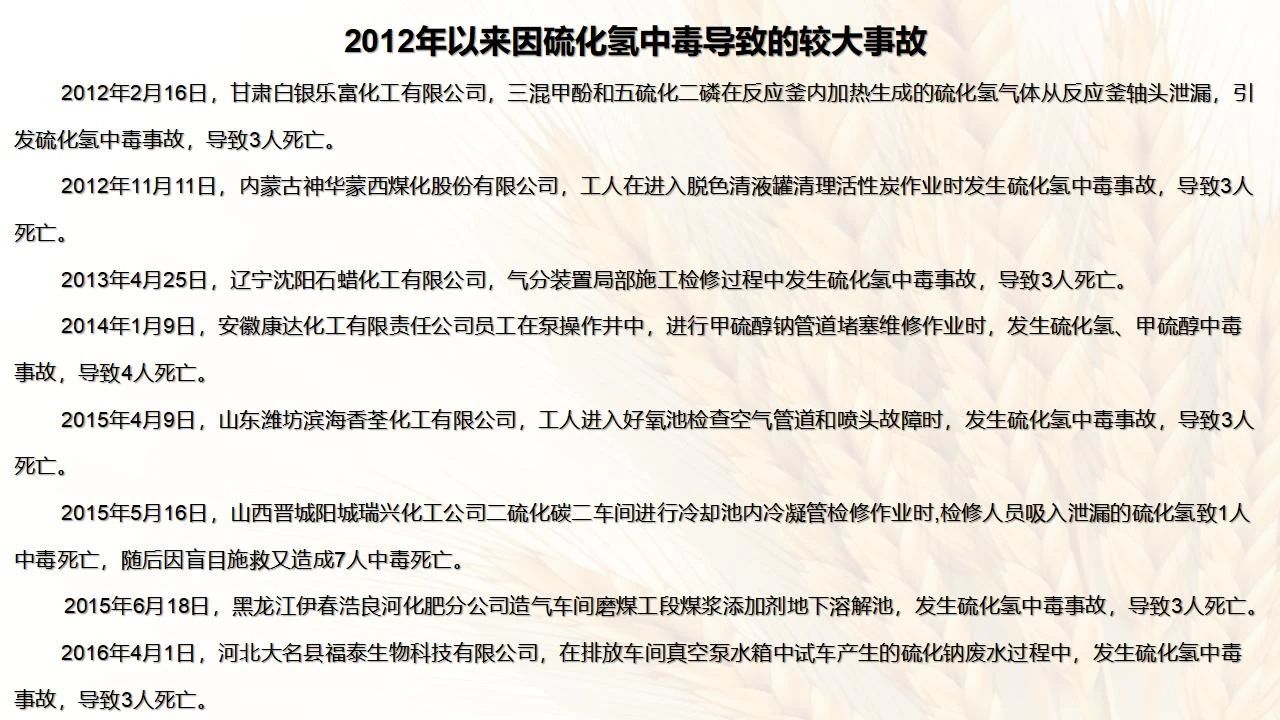 硫化氫中毒多由于含有硫化氫介質(zhì)的設(shè)備損壞,輸送含有硫化氫介質(zhì)的管道和閥門泄漏,違反操作規(guī)程、生產(chǎn)故障以及各種原因引起的硫化氫大量生成或逸出,含硫化氫的廢氣、廢液排放不當,無適當個人防護情況下的密閉空間作業(yè),硫化氫中毒事故時盲目施救等所致。