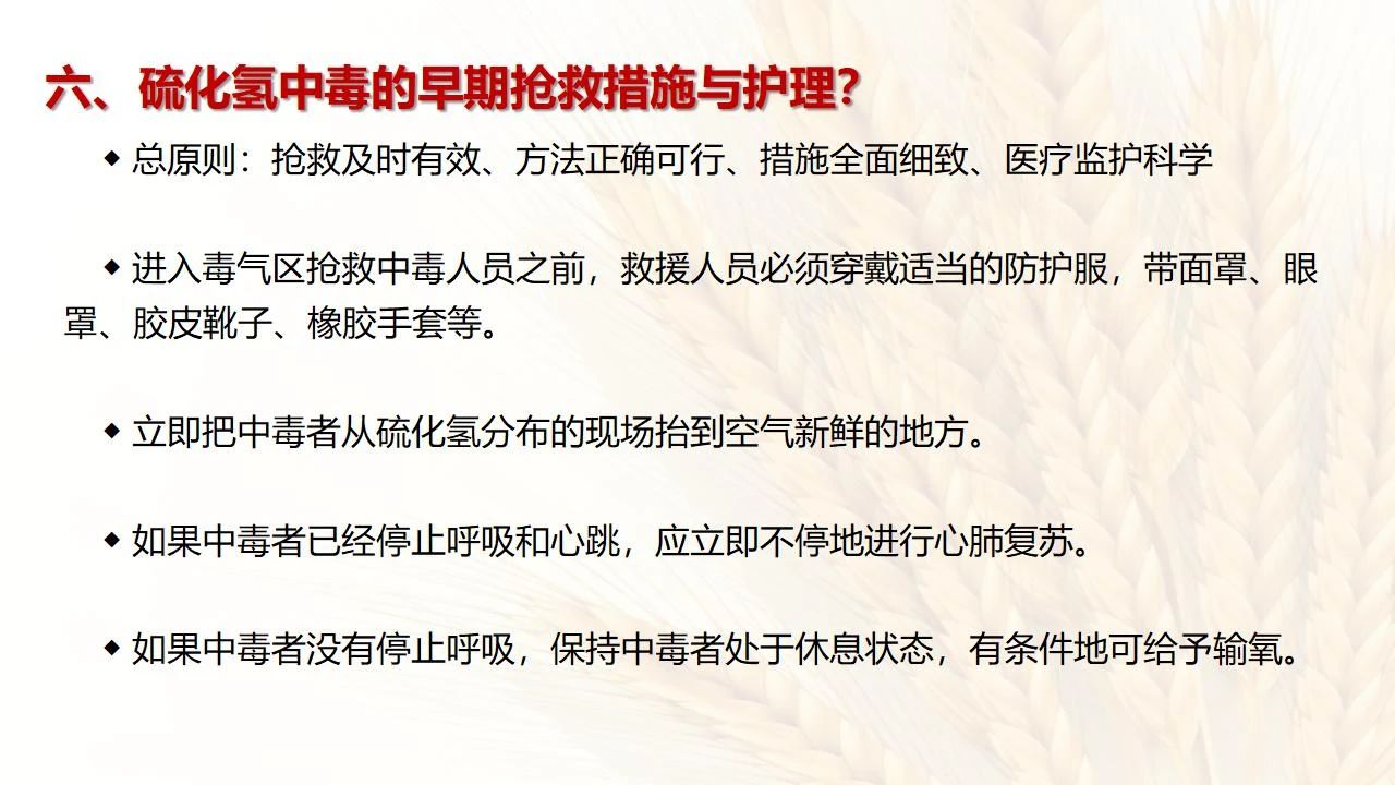 涉及硫化氫的裝置、設(shè)備設(shè)施應(yīng)制定硫化氫中毒專項應(yīng)急預(yù)案、現(xiàn)場處置方案,發(fā)生硫化氫中毒事故時,參與現(xiàn)場搶救者必須在做好安全防護保障情況下進行施救。應(yīng)穿隔離衣、戴防毒用具(空呼等),切忌盲目施救,謹防自身中毒。應(yīng)快速將患者抬離中毒現(xiàn)場,移至空氣新鮮通風良好處,解開衣服、褲帶等,吸入氧氣,及早使用糖皮質(zhì)激素,適當使用解毒藥物,同時積極對癥處理搶救者。對呼吸停止者,應(yīng)及時進行人工呼吸,有條件者應(yīng)及時行氣管插管、機械通氣。