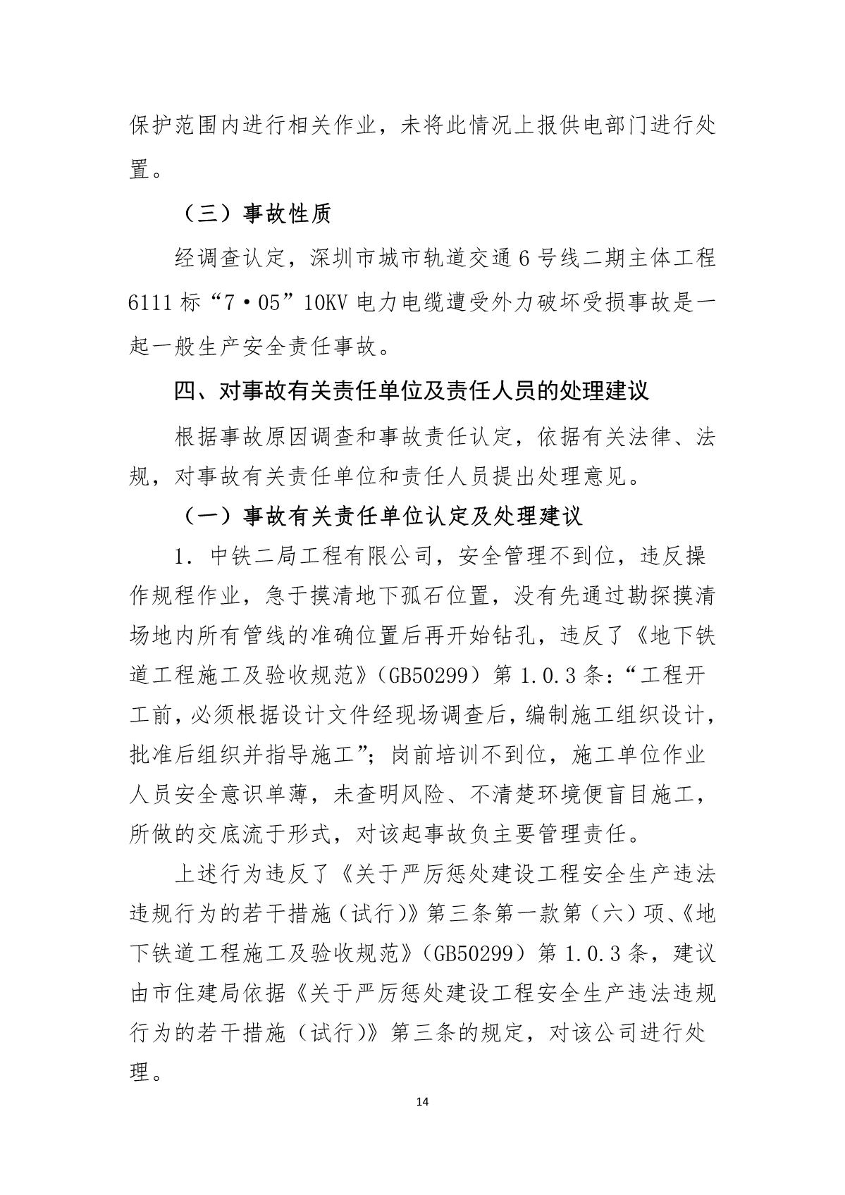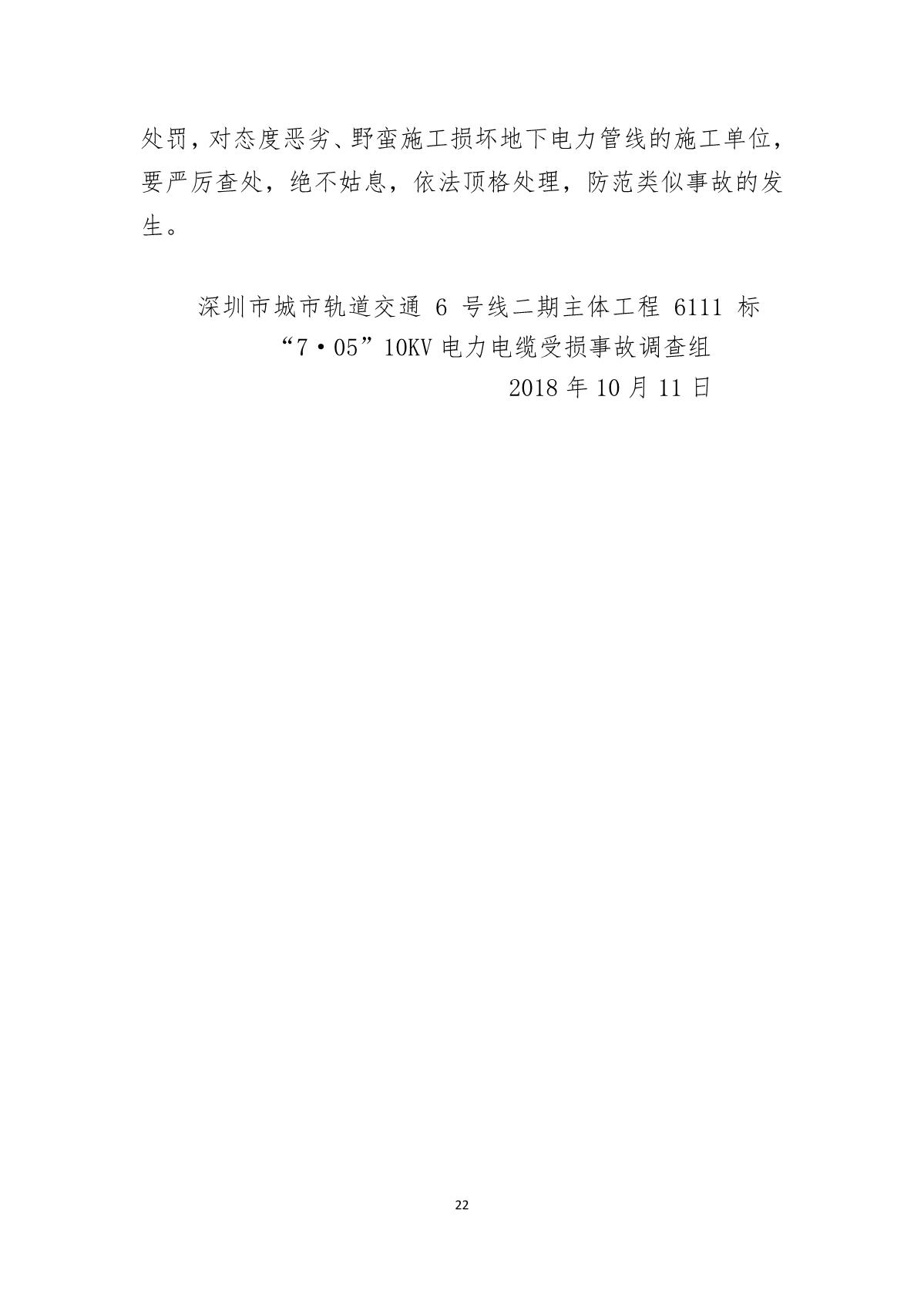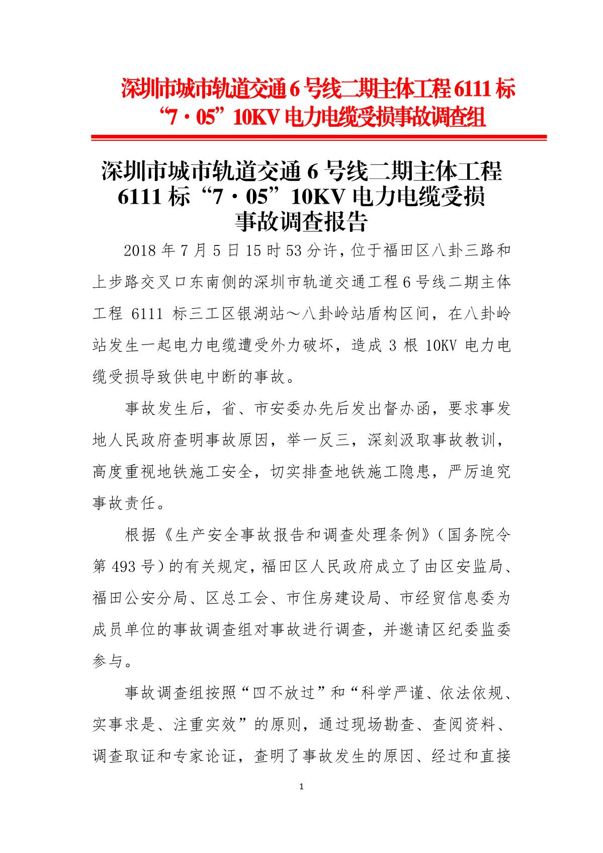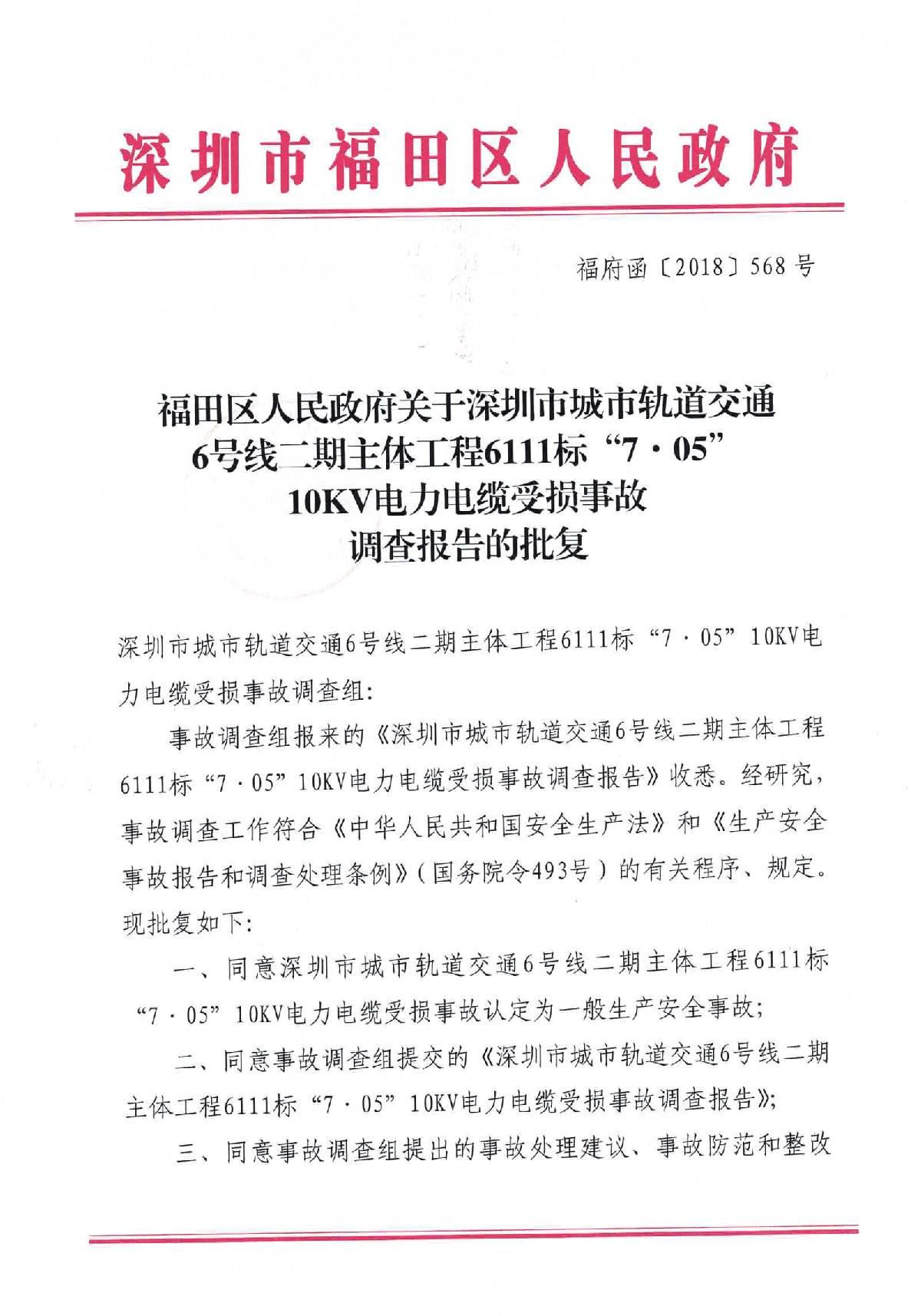 福田區(qū)人民政府關(guān)于深圳市城市軌道交通6號(hào)線二期主體工程6111標(biāo)“7.05”10kv電力電纜受損事故調(diào)查報(bào)告