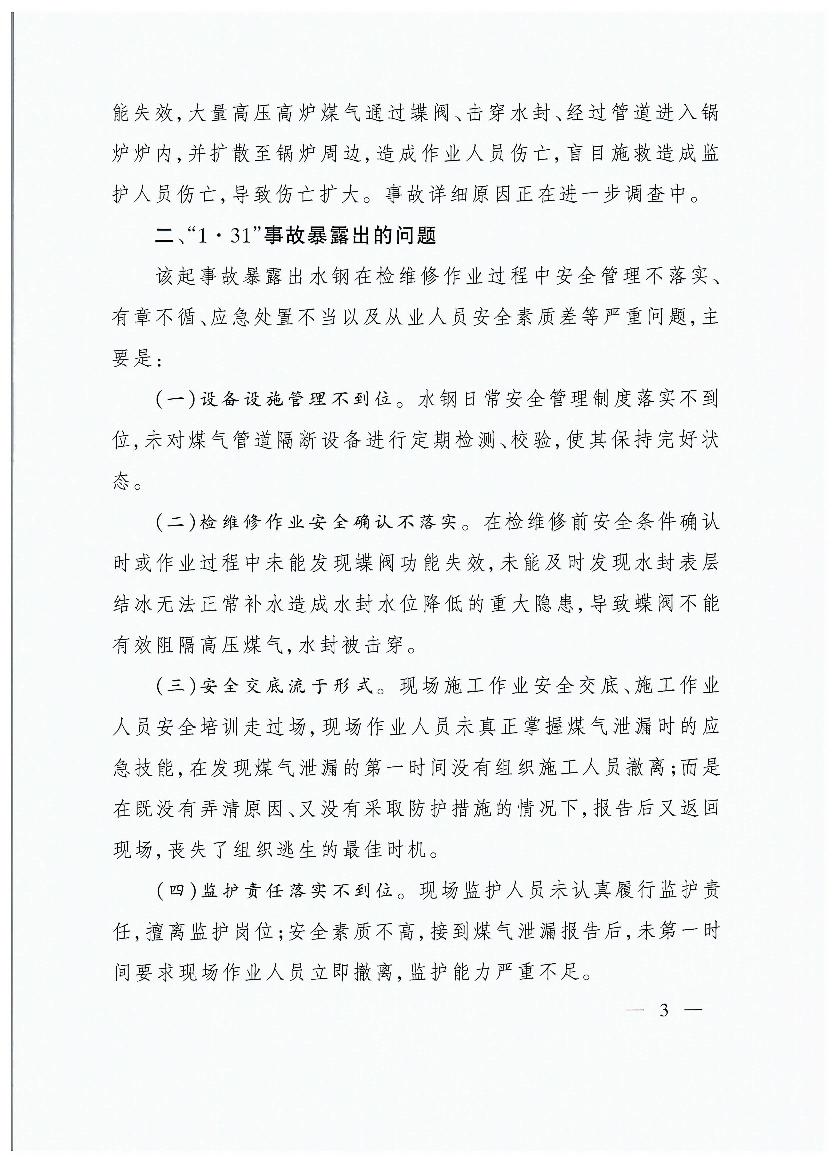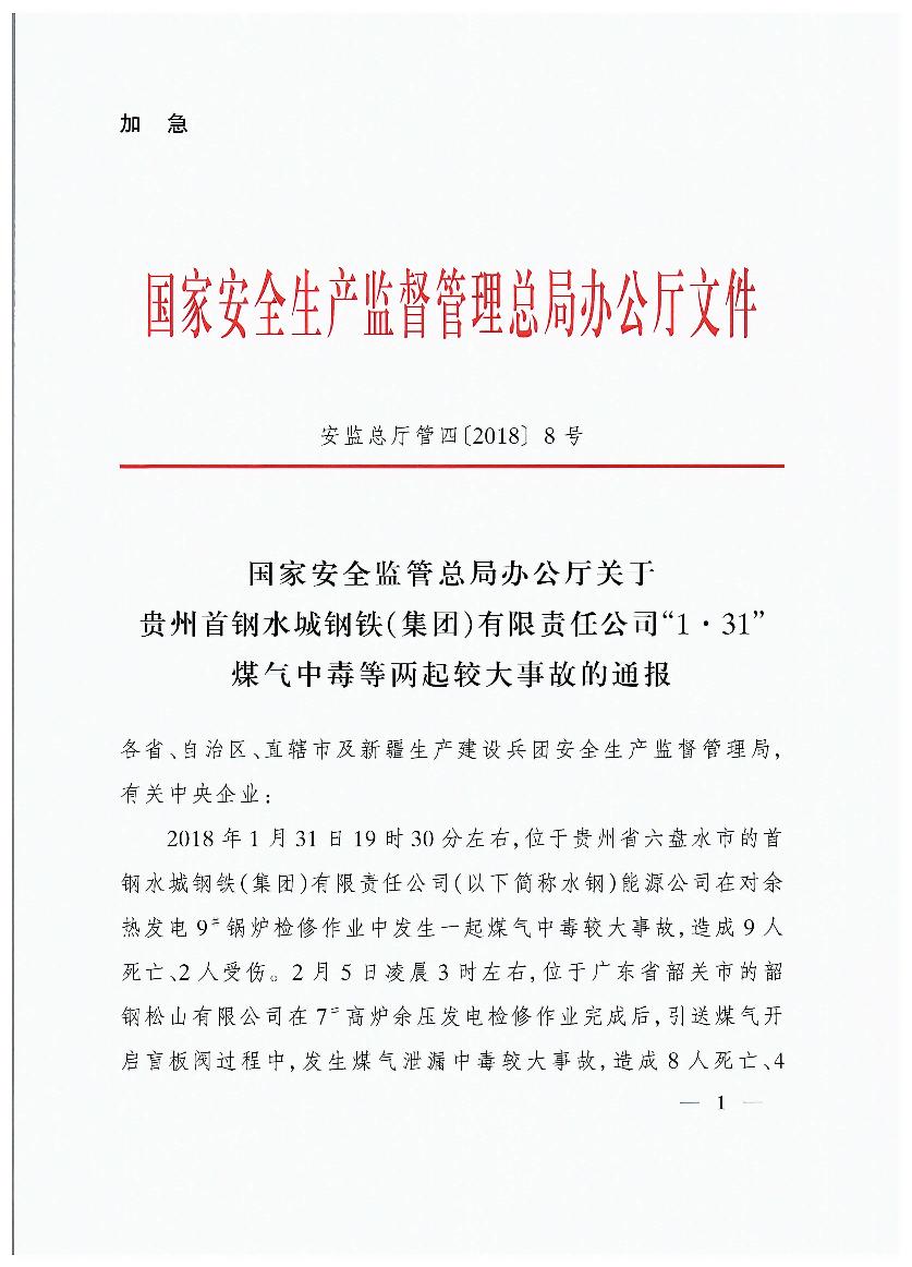 貴州首鋼水城鋼鐵(集團)有限責(zé)任公司“1?31”煤氣中毒等兩起較大事故的通報