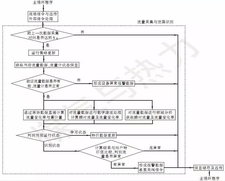 為實(shí)現(xiàn)上述功能,本地管道泄漏報(bào)警切斷裝置軟件程序邏輯架構(gòu)由基礎(chǔ)層、技術(shù)服務(wù)層、應(yīng)用層3層組成。基礎(chǔ)層包含各硬件操作的底層驅(qū)動(dòng)程序,如數(shù)據(jù)采集分析裝置與流量計(jì)、遠(yuǎn)傳裝置的RS485串口通信,SD卡數(shù)據(jù)的讀取與儲(chǔ)存,按鍵操作讀取等模塊。技術(shù)服務(wù)層為實(shí)現(xiàn)系統(tǒng)功能邏輯,提供相關(guān)的工具組件,調(diào)用基礎(chǔ)層的驅(qū)動(dòng)程序接口,對(duì)數(shù)據(jù)進(jìn)行解釋、加工處理,并向應(yīng)用層提供數(shù)據(jù)服務(wù)接口,方便功能邏輯的調(diào)用,包括開關(guān)閥指令處理、流量計(jì)數(shù)據(jù)采集與儲(chǔ)存、報(bào)警信息發(fā)送、報(bào)警數(shù)據(jù)儲(chǔ)存與讀取、參數(shù)信息儲(chǔ)存與讀取、數(shù)據(jù)的本地顯示、數(shù)據(jù)頻譜分析工具、時(shí)鐘校對(duì)等模塊。應(yīng)用層實(shí)現(xiàn)系統(tǒng)的邏輯功能,通過主循環(huán)程序周期循環(huán)調(diào)用流量采集與泄漏識(shí)別模塊、現(xiàn)場按鍵指令處理模塊、遠(yuǎn)傳外部指令處理模塊,實(shí)現(xiàn)系統(tǒng)的自動(dòng)運(yùn)行與對(duì)外交互。主循環(huán)程序運(yùn)行流量采集與泄漏識(shí)別模塊的程序流程見圖4。該部分為系統(tǒng)的核心功能之一,通過定時(shí)中斷程序?qū)崿F(xiàn)循環(huán)運(yùn)行。進(jìn)入主程序模塊后,首先判斷流量采集周期是否滿足,即當(dāng)前時(shí)間距上一次流量采集時(shí)間是否滿足采集間隔(5 s),如果否,則跳出本次流量采集與泄漏識(shí)別操作;如果是,則執(zhí)行泄漏識(shí)別運(yùn)行策略更新程序,檢查識(shí)別參數(shù)、指令是否有修改,并進(jìn)行數(shù)據(jù)更新。從流量計(jì)獲取實(shí)時(shí)流量原始數(shù)據(jù)與狀態(tài)信息,檢查數(shù)據(jù)的有效性,例如報(bào)文中是否有報(bào)警或錯(cuò)誤數(shù)據(jù),檢查流量計(jì)狀態(tài)是否正常。如果數(shù)據(jù)無效或流量計(jì)狀態(tài)不正常,則形成設(shè)備異常報(bào)警數(shù)據(jù),執(zhí)行信息儲(chǔ)存、遠(yuǎn)傳。如果數(shù)據(jù)有效,則對(duì)數(shù)據(jù)進(jìn)行計(jì)算處理及識(shí)別分析。計(jì)算處理過程包括3種方式,3種方式均通過原始流量數(shù)據(jù)計(jì)算某時(shí)段的流量累計(jì)值。對(duì)于原始流量變化比較平穩(wěn)即系統(tǒng)不存在調(diào)壓器喘振導(dǎo)致的流量頻繁波動(dòng)時(shí),可通過原始流量數(shù)據(jù)直接計(jì)算獲取流量變化率,速度較快,實(shí)時(shí)性較強(qiáng)。如果調(diào)壓器喘振導(dǎo)致流量波動(dòng)干擾較大,則需要將喘振干擾部分濾掉后再進(jìn)行下一步計(jì)算分析,可以對(duì)流量數(shù)據(jù)進(jìn)行數(shù)字濾波處理或頻域分析處理,然后計(jì)算瞬時(shí)流量及流量變化率。數(shù)字濾波處理和頻域分析處理這兩種方法,去除干擾的原理不同,可以選擇其中一種方法,或兩者都使用,達(dá)到雙重保險(xiǎn)的目的。這兩種方法實(shí)時(shí)性稍弱,但可有效降低喘振干擾造成的誤報(bào)。接下來判別當(dāng)前運(yùn)行狀態(tài),當(dāng)數(shù)據(jù)采集分析裝置用于管網(wǎng)用氣規(guī)律搜集即學(xué)習(xí)階段時(shí),程序不進(jìn)行泄漏識(shí)別操作,而是直接生成并儲(chǔ)存用戶特征數(shù)據(jù)。當(dāng)數(shù)據(jù)采集分析裝置用于管網(wǎng)泄漏監(jiān)測識(shí)別時(shí),程序?qū)?dāng)前計(jì)算結(jié)果與用戶特征值進(jìn)行比較,判別流量是否異常,當(dāng)有異常時(shí),形成報(bào)警數(shù)據(jù)甚至關(guān)閥指令,之后執(zhí)行信息儲(chǔ)存、遠(yuǎn)傳等后續(xù)主程序指令,完成一次循環(huán)。