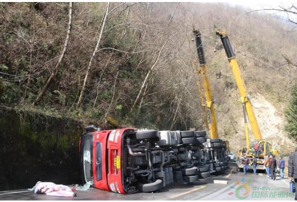 四川雅安石棉一裝載22噸液化天然氣運(yùn)輸罐車側(cè)翻