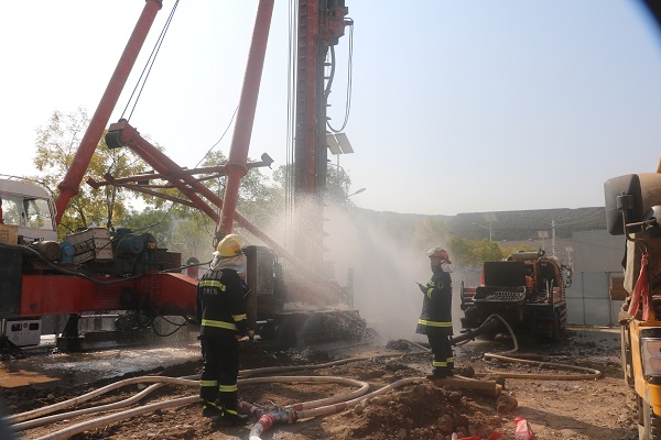 蘭州支隊七里河消防大隊第一時間到達現(xiàn)場參與處置,到達現(xiàn)場后發(fā)現(xiàn):現(xiàn)場管道仍處于天然氣泄漏狀態(tài),未有明火發(fā)生?,F(xiàn)場指戰(zhàn)員立即設(shè)置警戒線,對現(xiàn)場圍觀施工人員及群眾進行疏散撤離,對泄露事故點毗鄰居民樓進行人員通告疏散,同時設(shè)置水槍防護陣地。隨著增援中隊處置力量的到達,現(xiàn)場處置指揮員七里河大隊大隊長,統(tǒng)一指揮調(diào)度現(xiàn)場事故處置力量:首先,結(jié)合現(xiàn)場街道路況,設(shè)置疏散組,對毗鄰居民樓全面進行人員清查疏散。設(shè)置警戒組并專人看守,嚴防非事故處置人員進入。然后在先期到達成立的消防水槍防護陣地基礎(chǔ)上,增設(shè)水槍防護陣地;其次調(diào)派到達現(xiàn)場的增援消防中隊兩臺水罐消防車全程待命,做好供水保障。