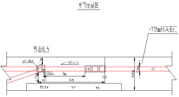 +775m回風石門設計長度580m,已施工241m,坡度3‰,直墻半圓拱斷面, 巷道凈寬4.8m,凈高4m,凈斷面積16.81㎡,支護方式為錨網索噴。巷道內鋪設軌道軌距為600mm,事故地點鋪設單道。