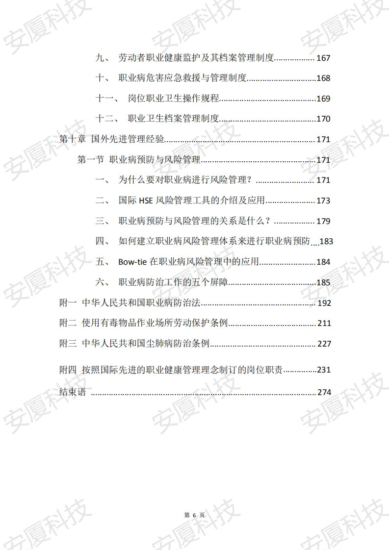 該書于2020年5月1日開始構(gòu)思著手創(chuàng)作,由安廈系統(tǒng)科技成都有限責(zé)任公司委托曲范輝、鄒異林、溫薇、高志堅、王希、朱威林進行編著,各方堅持勤勉努力誠實信用的原則,分別負責(zé)的各自章節(jié)的書籍編著工作,本書針對企業(yè)和個人的職業(yè)健康培訓(xùn)。內(nèi)容涉及職業(yè)危害識別、常見行業(yè)的職業(yè)危害、職業(yè)危害檢測、管理制度、部分現(xiàn)行的法律法規(guī)和標準等等,借鑒國際先進的職業(yè)健康管理理念和最佳實踐進行重新整理和創(chuàng)造。以從物理因素、化學(xué)因素方面進行講解如何防護職業(yè)病的發(fā)生。