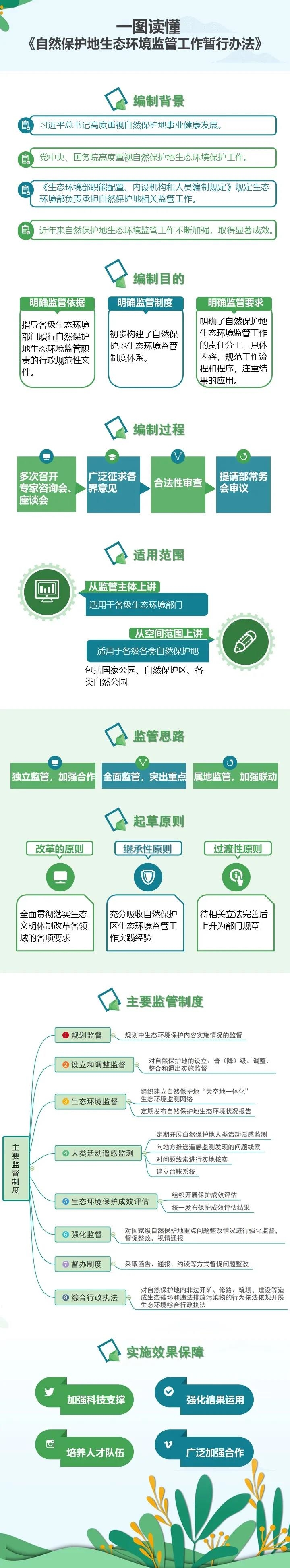 在這樣的背景下,生態(tài)環(huán)境部組織編制了《暫行辦法》,是深入貫徹習(xí)近平生態(tài)文明思想,有效落實(shí)黨中央國務(wù)院關(guān)于自然保護(hù)地事業(yè)改革各項重大部署,切實(shí)履行自然保護(hù)地生態(tài)環(huán)境監(jiān)管職責(zé)的重要舉措。其主要目的,一是明確監(jiān)管依據(jù) ,《暫行辦法》是指導(dǎo)各級生態(tài)環(huán)境部門履行自然保護(hù)地生態(tài)環(huán)境監(jiān)管職責(zé)的行政規(guī)范性文件;二是明確監(jiān)管制度,《暫行辦法》初步構(gòu)建了自然保護(hù)地生態(tài)環(huán)境監(jiān)管制度體系;三是明確監(jiān)管要求, 《暫行辦法》明確了自然保護(hù)地生態(tài)環(huán)境監(jiān)管工作的責(zé)任分工、具體內(nèi)容,規(guī)范工作流程和程序,注重結(jié)果的應(yīng)用。